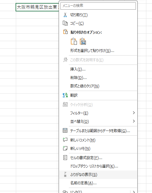 ただしこの方法はプレビューにしか出ないので他のセルを選択すると消えてしまう。セルにフリガナを記憶させたいときはセルを右クリックしてフリガナの表示をクリック。