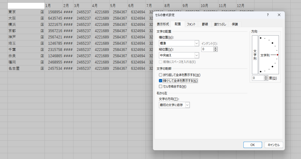 配置を選択し、文字の制御の縮小して全体を表示するにチェックを入れてOKを押す。