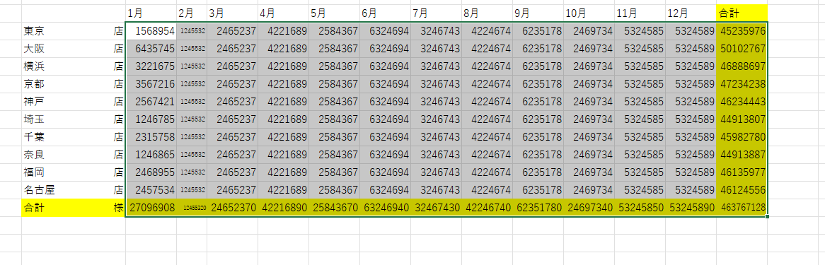 図のような合計を計算するときにSUM関数を入れなくても一発で計算するには、表を選択し、Shift+Alt+=同時押しで一発計算される。